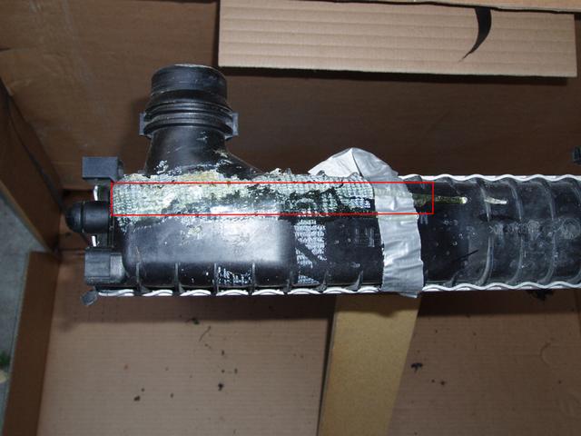 Närbild på skadan. Dock syns inte så mycket då jag var tvungen att tätta den med två komponents lim, detta för att jag skulle kunna köra den till verkstaden. Det blev ngr stopp på vägen med lite påfyllnad av vatten men det var mycket små mängder som läckte ut. Bättre "safe than sorry". Inom den rödmarkerade rektangeln var sprickan.