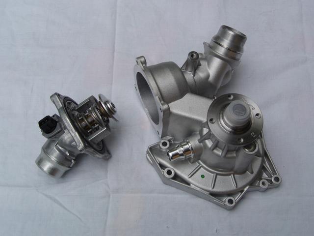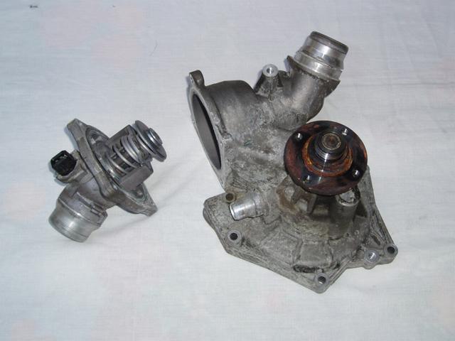 Den gamla vattenpumpen och termostaten såg båda fräscha ut. Vattenpumpen var ren invändigt och inget satt löst eller var defekt, men bäst att byta när man ändå håller på.