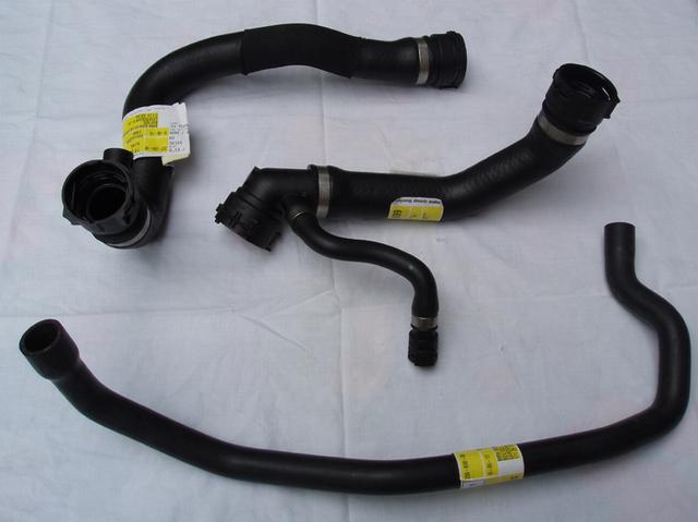 Bild på de nya slangarna med snabbkopplingar. Överst är den nedre kylslangen. I mitten syns den övre kylslangen. Längst ner är den långa slangen som går in i motorns bakre del. Denna har jag ej bytt ännu då den sitter väldigt tight till men enligt min mekaniker så är det inte ovanligt att den får en spricka längs med ryggen pga. att den är böjd samt värmen. Oftast kan man märka att det börjar droppa under bilen, ser ut som det kommer från växellådan/konverten och många tror att det är läckage från dessa men så är oftast inte fallet. Bra att tänka på ialla fall:)
