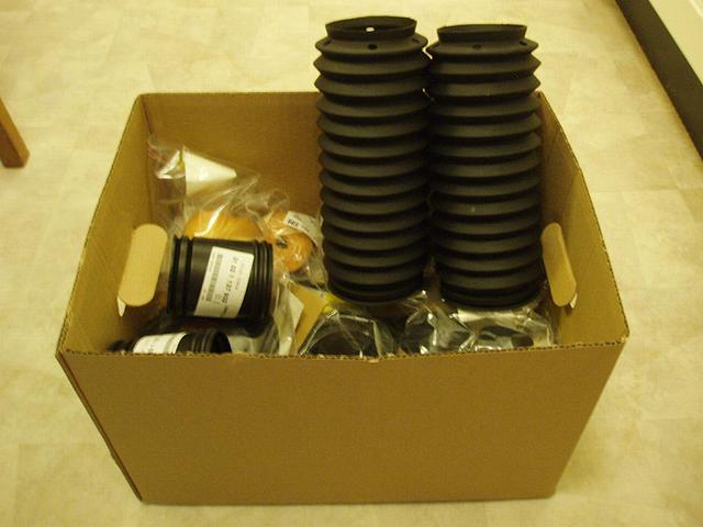 Passade även på att byta alla slitage delar som har med stötdämparna att göra som tex. dammskydd, extra dämpare, fjäderunderlägg övre och undre, skyddsrör, fjäderskiva m.m. Även div. muttrar, skruvar samt brickor passade jag på att byta. Det blev en kartong med tillbehör......