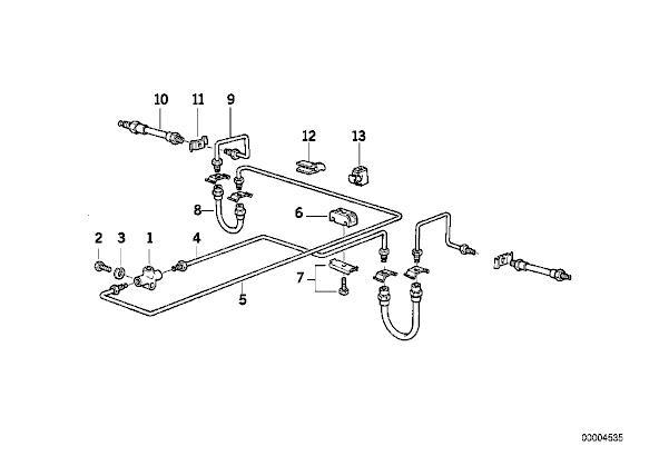Här är motsvarande skiss (från realOEM) på bakre bromsrören. Rör nr 5 verkar mest rostigt, men det kanske är lika bra att byta alla rör bakom T-kopplingen (nr 1) och slangarna (nr 8 och 10) när man liks håller på.