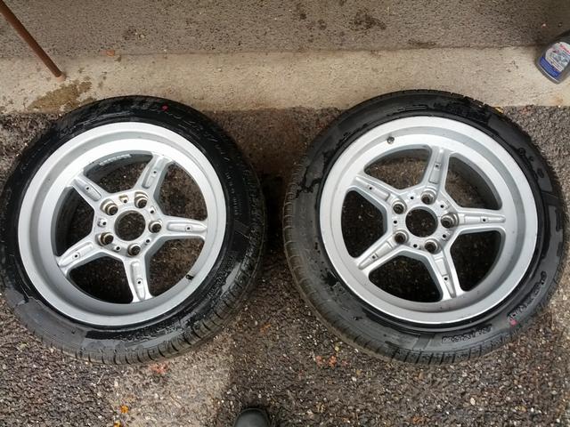 Grovrengjorda M-fälgar system II till E34. Av för mig okänd anledning har jag fälgar med två olika artikelnummer trots att alla fyra är 8x17". På denna bild ser man små skillnader mellan 2 226 403 och 2 226 706.