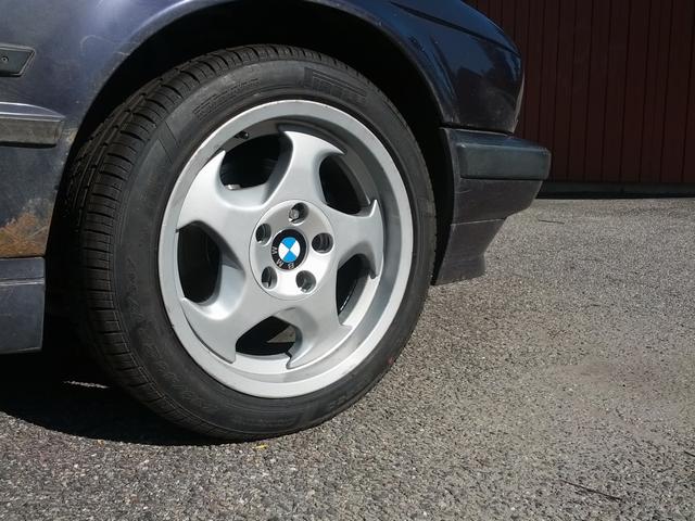 M-fälg system II med ny navkåpa på min E34 -96. Rost i framskärm återstår att fixa som synes.