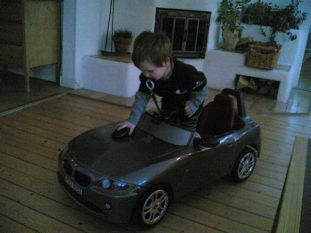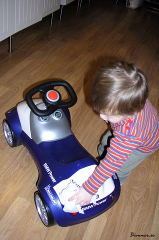 Vad gäller hans framfarter med den eldrivna bimmern i hemmet så kan han iallafal backa och köra framåt samt styra när han vill, bromsen är totalt ointressant då han hellre krockar med hunden eller varför inte mula pappas skenben.