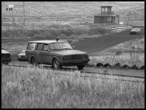 Dagen var kommen och vi hade lastat bilen på släp och körde mot Laholm, allt gick bra tills vi kom till Hallandsåsen… Efter toppen började vi köra ner för åsen, Volvon på släpet tryckte på ORDENTLIGT och släpet började wobbla, det blev värre och värre och vi hade nu problem att stanna kvar på vägen, till slut wobblade släpet så pass att vi hade fyrhjulssläpp på dragbilen och situationen var riktigt otrevlig, vi var båda beredda på krasch men föraren lyckades i sista sekund få ner hastigheten och svängningarna, skärrade som vi var körde vi fel och anlände till banan lite senare än tänkt, som tur var hade vi en förtrupp som hade bokat in en fin plats till oss.