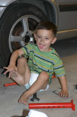 Hmm, kanske min son kommer att bli en god mekaniker? Han älskar bilar och verktyg och det gick inte att ta miste på hans glädje när han fick "hjälpa" till med krängningshämmarna 2 år och två månader gammal.... jojo.