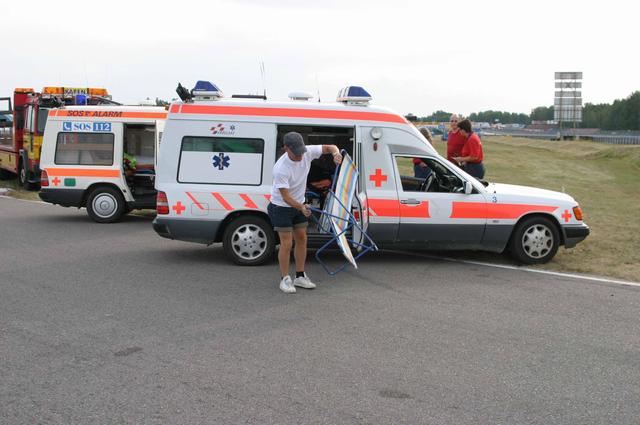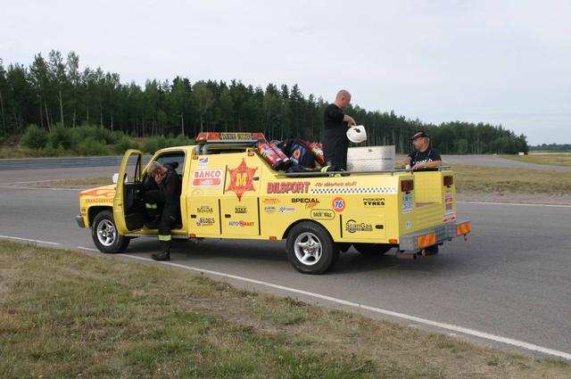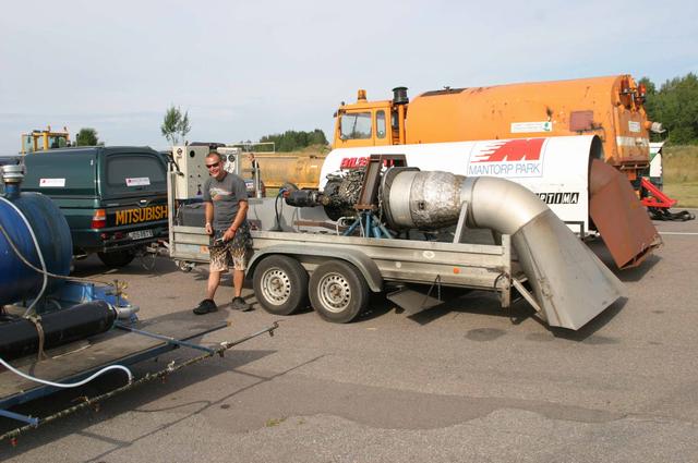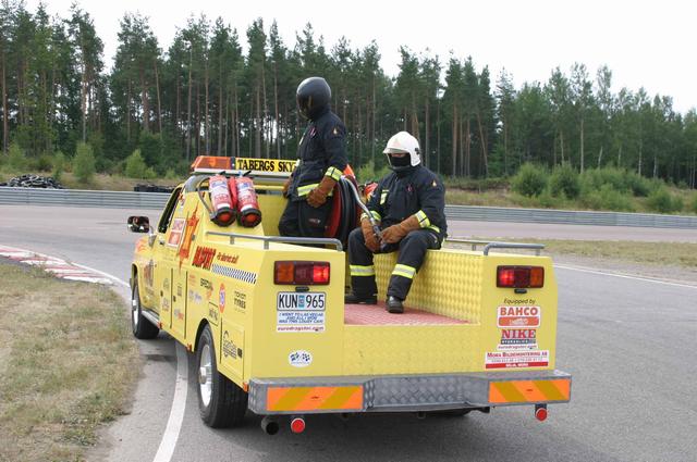 Vi riggade upp som vanligt med 2 ambulanser, bärgare och allt annat. Mats fixade solstolarna, för det gäller att softa lite också (bild 1). Grabbarna i släckningsbilen hade det varmt och gott, i de högra klasserna gäller högsta beredskap och då är det full mundering som gäller i sommarvärmen (bild 2-3). Danskarna var på plats med sin lilla vattenblåsare (bild 4). Den fungerar säkert bra till att blåsa löv också, men med tanke på att den drivs av en dieselturbin så lär gräset bli rätt torrt. Och ni kan ju alla gissa vad det står baktill på utblåset? ”Need a blowjob ?” såklart, toppat med ägarens mobilnummer.