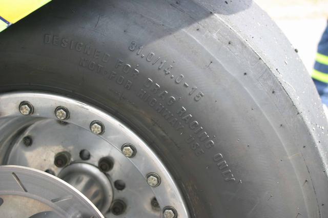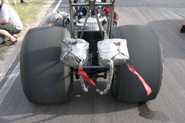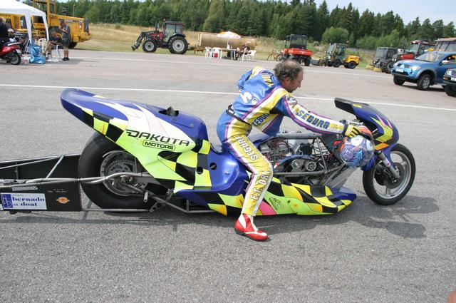 Fransmannen Eric Teboul stannade till med sin top fuel bike som enligt uppgift gör 0-100/kmh på 0,7 sekunder (bild 17). Jag vet inte om jag ens kan se detta som en motorcykel. Men med tanke på hastigheterna så har jag överseende med stödhjulen ;-). Och bakdäcket var ju inte precis standard (bild 18). För att få en känsla av hur feta dessa däck är så kan ni ta en titt på Ulf ”skutt” Nyléns hoj (Bild 19). Jag fick en pratstund med herr Teboul och kunde inte låta bli att fråga vad man kör för bil till vardags om man håller på med denna typ av helg förströelser. ”I drive a Renault station wagon… I have a wife and kids you know” blev svaret. Hmmm, besvikelse. Men så tillägger han leende ”O, and a Corvette of course… just for fun”. Ja, jag tänkte väl det!
