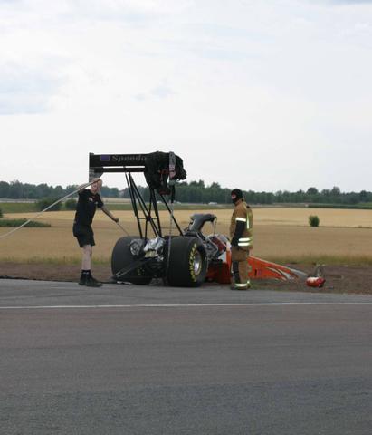 Thomas Nataas ”batmobile” var också på plats (bild 9). De här bilarna har så konstiga proportioner med sjukt stora vingar och extrem längd att däcken nästan ser ut som ett par hederliga 17”, men de är feta!!! Hastigheterna är otroliga. När jag står vid målrakan så hör jag först bullret genom radion, sedan kommer ett fruktansvärt muller och då har bilarna redan tillryggalagt halva sträckan. I topfuel gör bilarna 0-100 på en sekund. Eller som det stod i programmet, en Ferrari Enzo gör 0-300km/h på 27 sekunder, TopFuel bilarna gör det på 3sek !!! Inte konstigt att man behöver bromsskärmar. Micke Kågereds ena skärm löste inte ut, och vips så stod han med nosen i sandfållan (bild 10).