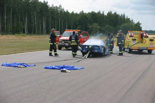 Annat minnesvärt från dagen var en kompressor som med en hög smäll skickade denna lilla pärla över oss och ca 100m ut i terrängen (bild 20), Richard Sunblom vars vevstake sade god natt i en enorm rökpuff (bild 21 är tagen när röken skingrats) och givetvis en, en… volvo? Janne ”snowball” Palmquist körde sin volvo c70 i klassen pro stock (bild 22). Han var dock inte nöjd med att som bäst prestera 7.33/ 298. Personligen tycker jag att det är rätt bra för en c70, men det är klart. Allting är relativt!