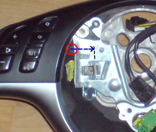 Demontering av airbag. Mejsel förs in genom "gummihålet" på baksidan av ratten igenom det röda hålet på bilden. Mejseln, (blå pil) trycker fjädern (svart linje) inåt centrum. Håll mejseln med plattsidan uppåt, så du får så bred ytan av den som möjligt mot fjädern.