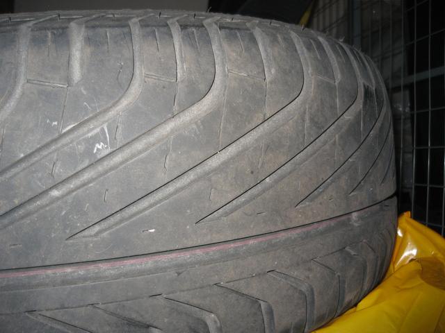 Framdäcken ser ut så här, dom har rullat 7000 mil!!! Vredestein sporttrac 1. Cirka 3mm kvar i mitten, sidorna närmar sig slicks!