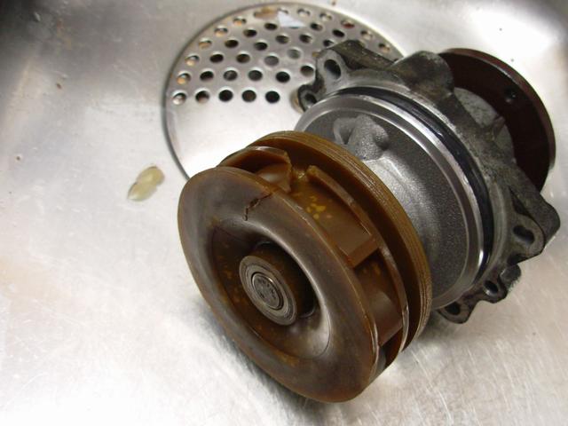 Trasig vattenpump, sprickan gjorde att den slirade på axeln, ibland..........