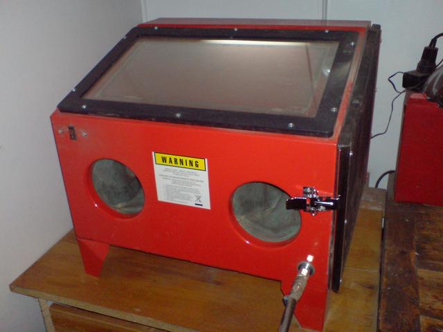 Blästerskåpet invändigt. Inte helt nöjd med detta skåp, för klen blästerpistol, svagt ljus och luckan läcker ut sand och damm. Skall åtgärdas med tätning och möjligen en lampa till.