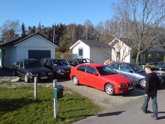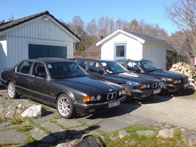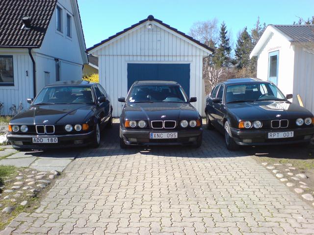 730iA e32, 540iAT e34 och 520i e34. En 525iT e39 i garaget och ett 525 e34 lik på utsidan.