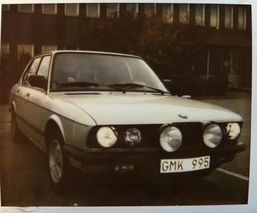 Köptes av Kneippbadens bil i Norrköping. Jag hade den i ca 4 år. Under min ägo monterade jag in värstingstereo med bland annat två 15"-subbasar i 7'e ordningens låda i bagageutrymmet. Spelade 132 db vid ett tillfälle. (Madonna, Vouge). Tävlade även i billjud precis när det var nytt i Sverige. Kom 3'a när jag tävlade i Norrköping. Bilen slutade sitt lyckliga liv i en last-truck i Norrköpings hamn. Det ösregnade och jag var på väg till en datamässa i Stockholm. Regnet vräkte ner och jag kunde bara köra i typ 40-50 km/h. Kör sakta om en jättestor lasttruck som kör parallellt med mig. När jag är jämsides så svänger plötsligt trucken och jag har inte en chans annat än att ramma rakt in i trucken. Precis innan hann jag tänka att den stackars truckföraren, som man kunde se hela ryggen av, skulle slå ihjäl sig. Ni vet, man ser ju rakt in genom truckarna med stora panoramaglas. Han såg så oskyddad ut där han satt på sin "pall". Jag brakade rakt in i baken på trucken och det var en fruktansvärd smäll trots att hastigheten bara var ca 50 km/h. Hela fronten på min 528 blev helt mosad och framvagnen var totalt skrot. Hela bilen var helt sne och även taket var inte lika rakt som innan. Ja, min bil var bara att skrota. Själv klarade jag mig ganska bra med lite ont i bröstet från säkerhetsbältet och ont i axeln för att jag försökte dämpa smällen genom att hålla emot i ratten av någon anledning.