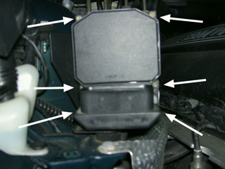 Sedan är det bara att lossa de sex torxskruvarna som håller modulen mot hydraldelen. Se pilar.