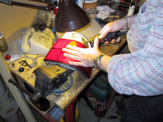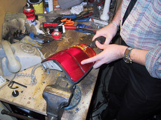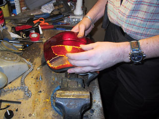 Beställ glas från Reproglas.![]() Skruva loss baklyktorna från insidan. Fyra 8 mm muttrar på varje sida. Tryck ut lyktorna. Vik undan gummilisterna så gott det går och börja kapa ur det oranga glaset. Vi använde en Dremel till detta. Var försiktig vid kanterna, risken finns att skada dels lyktans gods, dels gummilisterna. ![]() Här tar vi bort den urkapade biten. ![]() Sedan är det dags att få bort allt orangefärgat glas och göra kanterna jämna och fina. Det som är kvar av glaset i ovankant kan försiktigt brytas bort efter det att man kapat in jack med jämna mellanrum. Slipning och filning tills alla spår efter orange glas är borta. Eventuella rester kommer att synas tydligt så det är viktigt att det bli rent. ![]() I nederkant är det den hårda vägen som gäller. Fila och slipa. Till slut är det rent och jämnt. Fila ned eventuellt gjutskägg på glasen och kolla så dom sluter så tätt som möjligt. Annars är det bara att fila vidare, det blir mycket lättare att få tätt sedan om inga glipor finns. När man är nöjd med passformen är det bara att limma fast med lämpligt lim. Täta med silikon när limmet torkat. Måla sedan kanten mattsvart. ![]() Klart. Så här blev det. ![]() Hantverk: Staffan Swanström |