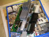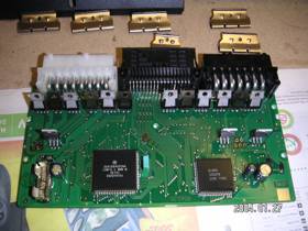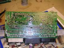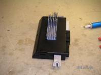 Här är spänn klippsen som håller effekttransistorerna mot kylflänsen bortmonterade och själva kylflänsen. Även effekttransistorerna för höger och vänster helljus är bortlödda.
