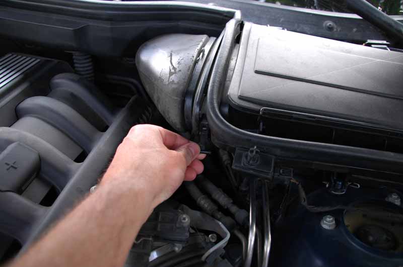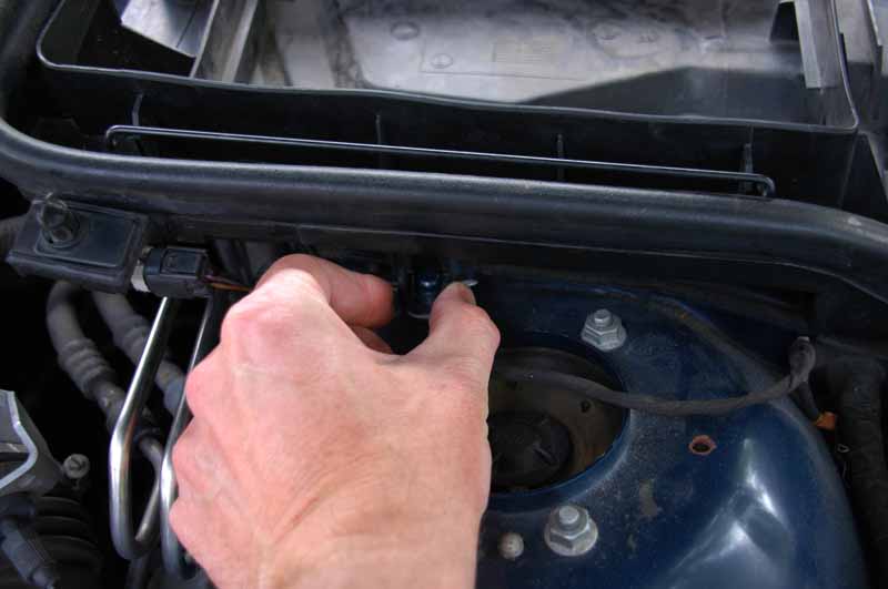 Börja med att lossa luftkanalen från det vänstra kupéfilterhuset. Snäpp loss hållaren.