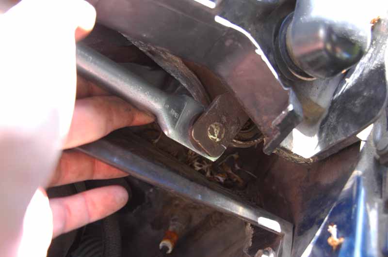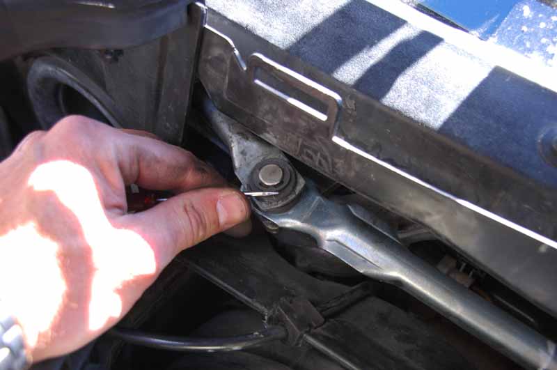 Lossa staget till den högra torkaren. Lossa staget till den vänstra. Dom lossar rakt upp med handkraft.