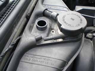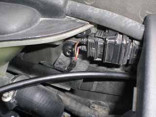 2) Fortsätt med att lossa på expansionskärlet. Det sitter fast med 2st plastmuttrar i torpedväggen. använd 10mm hylsa och eventuellt en förlängare. Ryck bort kontakten som är i vägen för den ena muttern. Se bild 1. Lossa på Diagnosuttaget. Se bild 2. Använd en liten mejsel som du trycker ned i springan. Dra rakt upp.