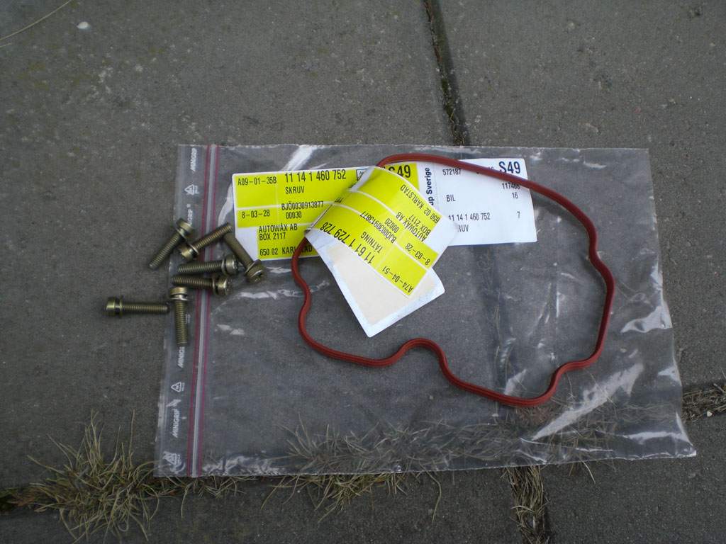 Jag köpte ett insugsmembran, 7 nya torxskruv samt en packning som skall sitta i insugets bakkant. Detta kostade 404kr på BMW. Glöm inte bort att beställa gummibussningarna som skall sitta på kåpan.