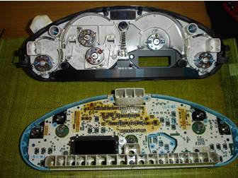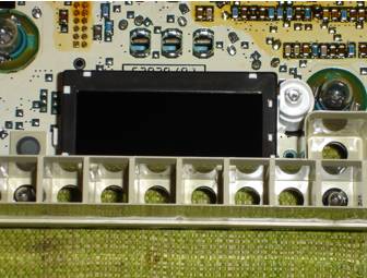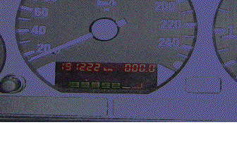 Displayen består av en LCD, vilken är upplyst bakifrån av två glödlampor. Den ena lyser upp räknaren och den andra lyser upp serviceindikatorn. Eftersom endast den övre halvan syns är det uppenbart att problemet finns i LCD: n och inte i glödlamporna. Problemet uppstår på grund av ett glapp mellan LCD och PCB (printed circuit board). Dessa är sammankopplade av en zebrastrip (gummigrej som leder ström) som med tiden kan tappa sin spänst och förlora kontakten. Detta åtgärdas genom att LCD med tillhörande zebrastrip byts mot en fungerande. Jag fick tag på en zebrastrip från ett huvudinstrument från en 325 -93. Det är lite av en chansning att hitta ett fungerande huvudinstrument då man inte med säkerhet vet om displayen funkar. Jag köpte ett huvudinstrument med spräckt glas vilket gjorde det mycket billigare (400: -).