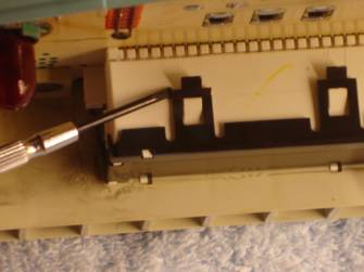 - Tag bort huvudinstrumentet genom att skruva ur de bägge torx-skruvarna (T20) i överkant. För in ett plastkort eller en liten skruvmejsel under fästpunkterna för att få loss instrumentet. Ta loss de tre kontakterna i bakstycket. De är av bajonettyp och kan vara lite trixiga att få loss. (för utförlig beskrivning och bilder, se mekartipset ”återställning av döda pixlar i huvudinstrument”.