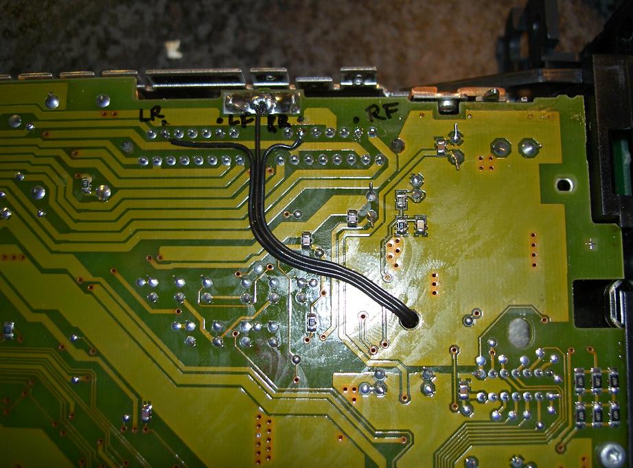 4: Lokalisera lödpunkterna på undersidan och löd fast tråd på de signaler som önskas. Jag ville bara ha bakhögtalarna och gjorde som på bilden. (BILD 1)