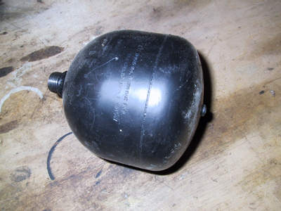 Om det stämmer låter det som om "bomben" läcker. Det är en bromstrycksackumulator. Den är svart, ser ut som en bomb (doh!), och brukar sitta i närheten av huvudcylindern. Den kostar runt tusenlappen ny. Den är ganska lätt att byta, men det kan vara lite trångt. Kan finnas att få tag i begagnad, men kolla noga att den är OK. Vissa påstår att det kan kollas genom att försiktigt sticka ned något smalt och långt i bomben, om botten nås är membranet trasigt. Denna metod är dock ej bekräftat av säker källa.