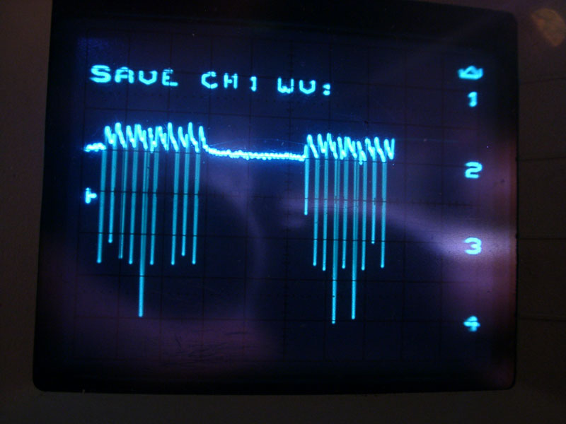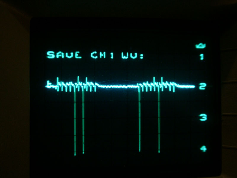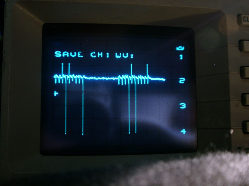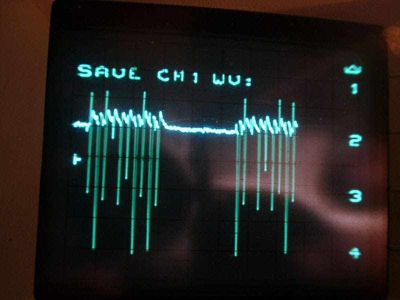 Jag har testat rätt så många olika varianter för att se hur lampan och amplituden påverkas med dioder, motstånd och kondensatorer i olika valörer för att komma fram till slutresultatet. Med ett inkopplat occiloscope med 1V/linje och 2ms svep så ser amplituderna ut så här vid olika mätningar.