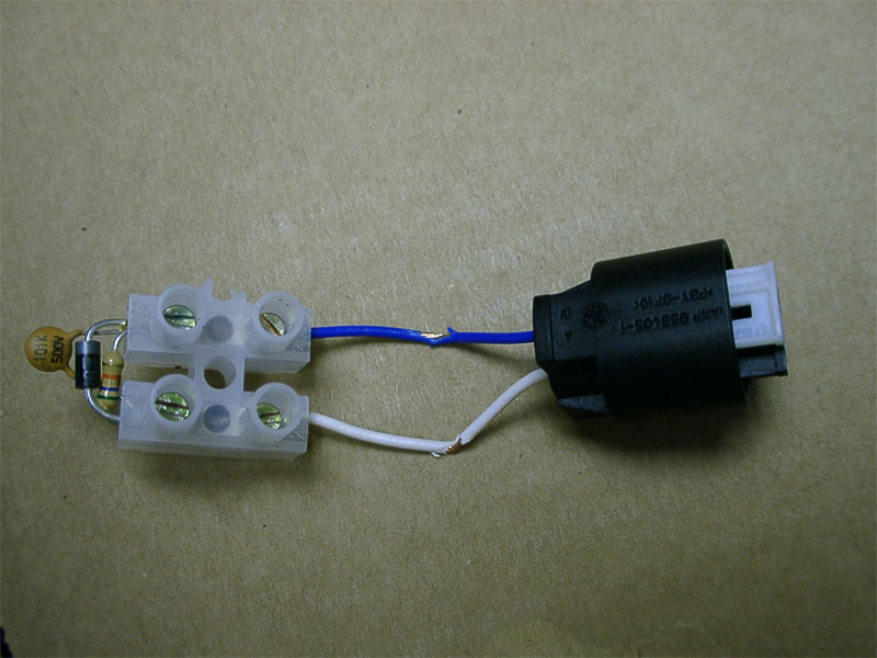 Bild 7. Den blå kabeln ska sitta på diodens spärriktningssida dvs. där strecket sitter, allt monterat i en sockerbit