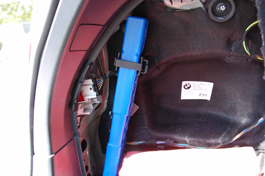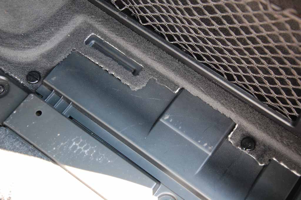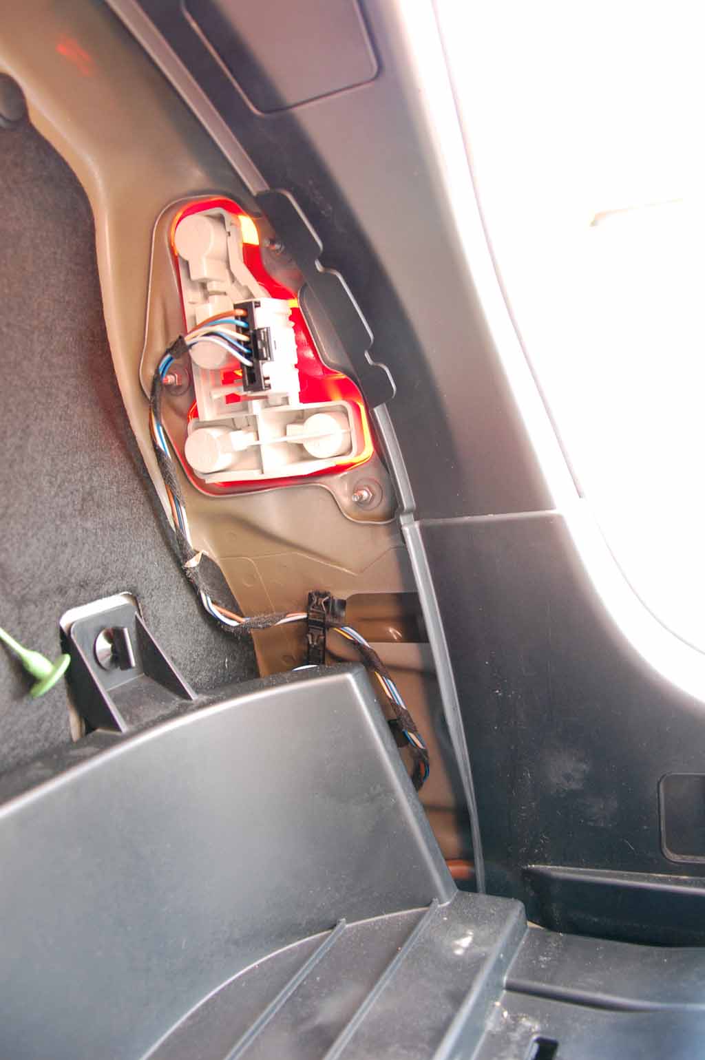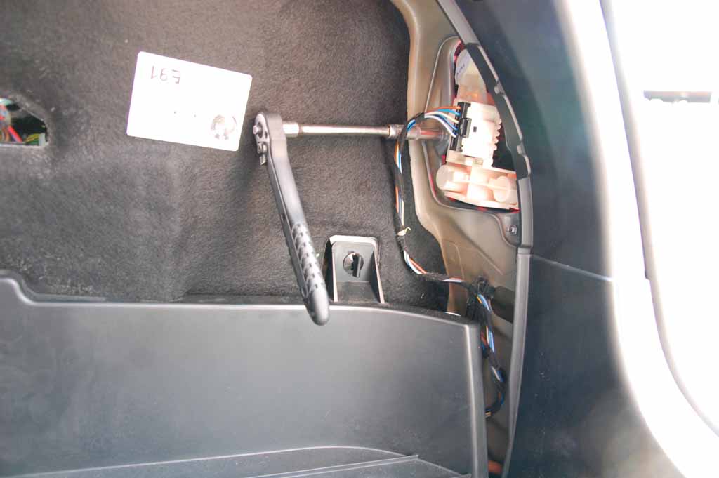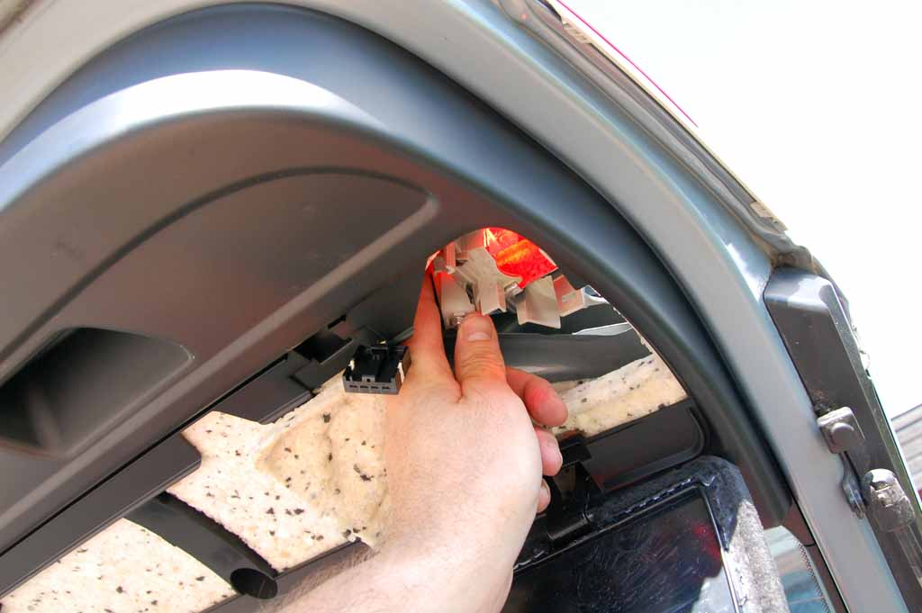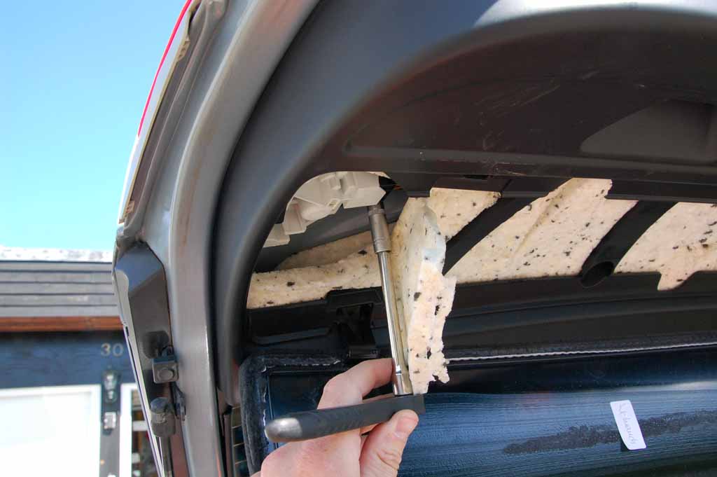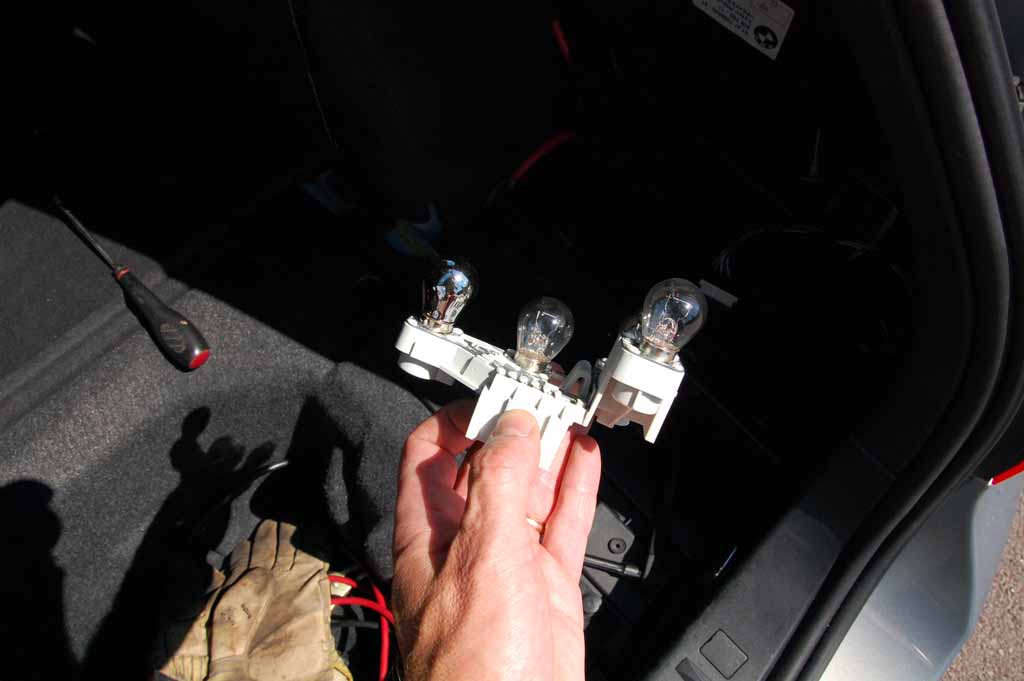 För att komma åt lamporna i bakluckan demonteras klädseln enkelt genom att tre clips frigörs med en mejsel eller liknande.