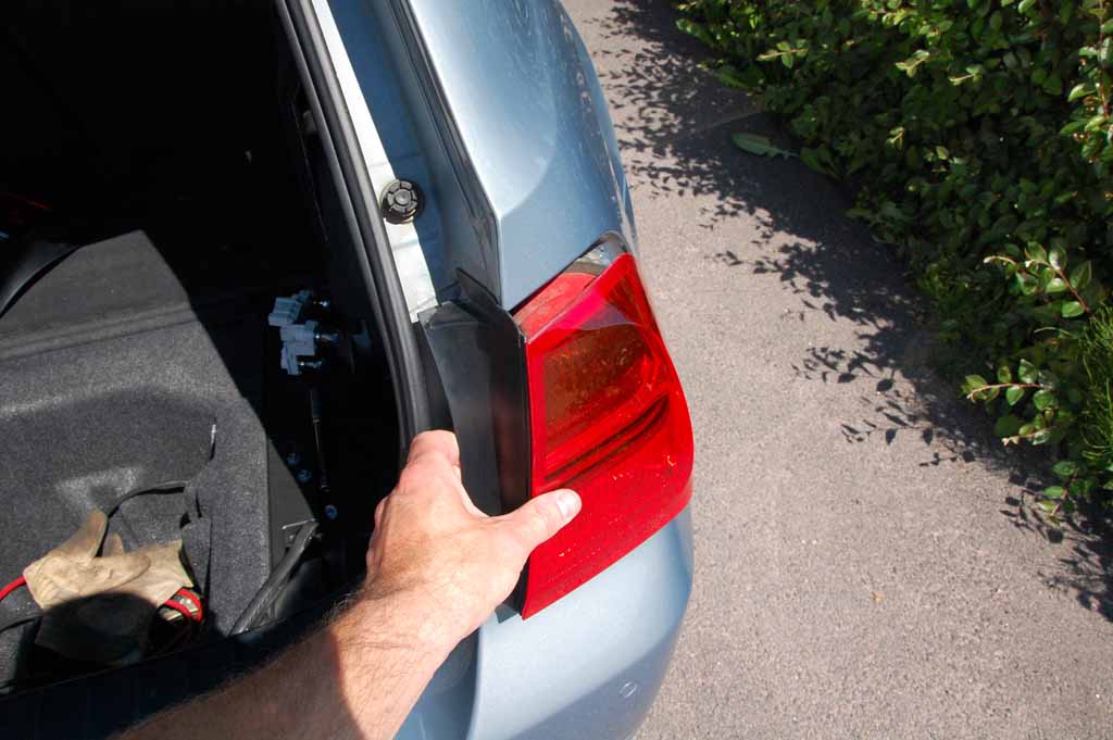 Vik ut bakljuset så hakarna som fäster i karosskanten frigörs.