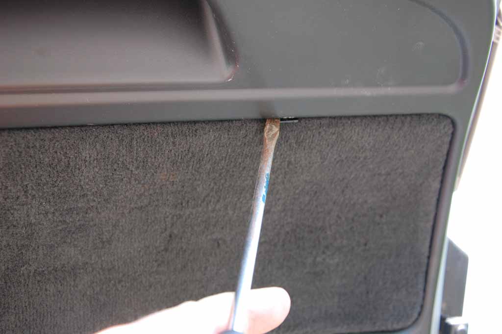 Jag började med höger bak. Lossa de två plastskruvarna som håller panelen genom att vrida dom ett kvarts varv och ta sedan bort dom.