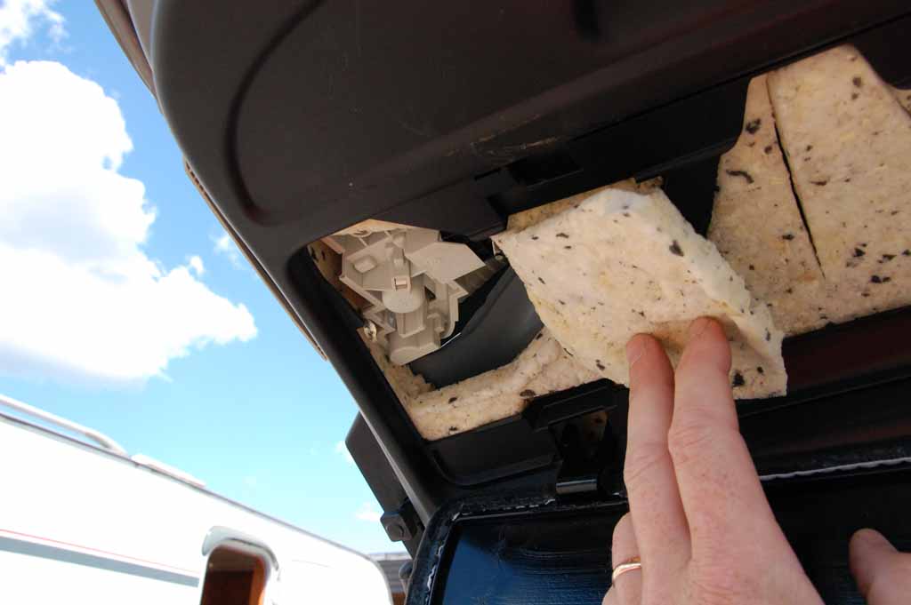 På vänstersidan lyfts panelen bort och varningstriangeln demonteras. I övrigt samma tillvägagångssätt.