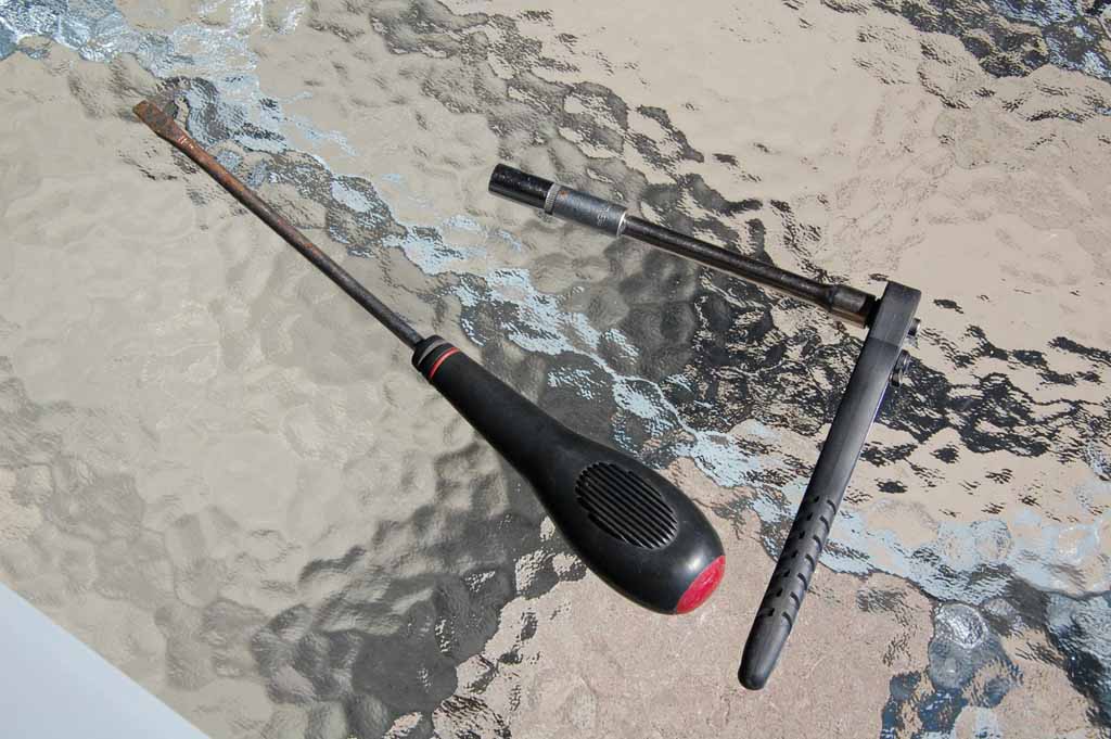 Verktyg som kan underlätta arbetet. Förslagsvis spårmejsel av mellanstorlek, 1/4 tum spärrskaft, förlängare och lång 8 mm hylsa.