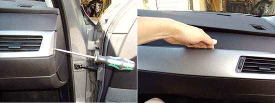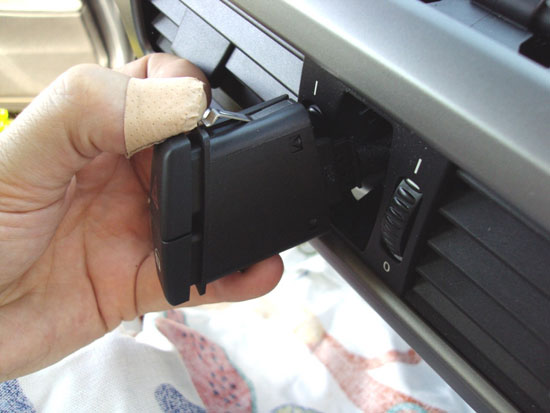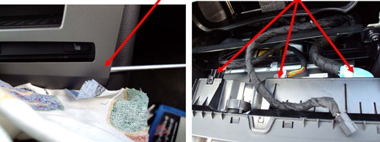 Sidoclipsen sitter precis ovanför förvaringsfacket. Sätt in en spårmejsel där och bänd försiktigt så släpper dom. Dom nedre clipsen är svåra att komma åt men brukar släppa om man bänder försiktigt precis ovanför brytningen i panelen. Ta sen bort de 3 AC-kontakterna.