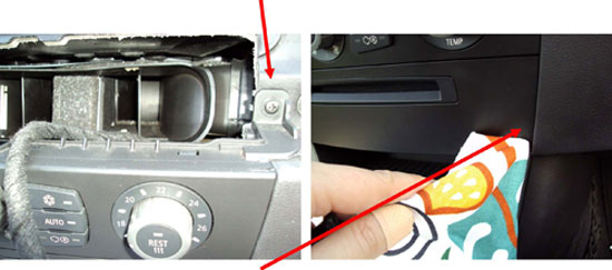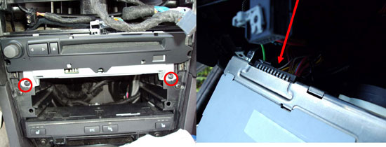 - Lyft bort centerpanelen och skruva bort de 2 inringade krysskruvarna som håller CDn. Ta ut CDn och lossa antennkabel/kablar och det stora svarta kontaktdonet. Lägg undan CDn.