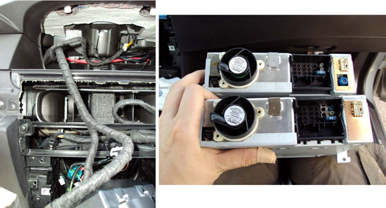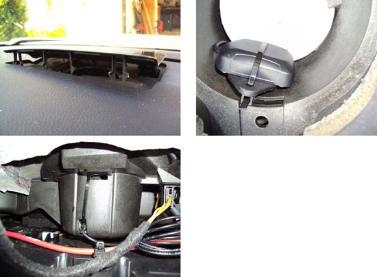 - Rakt bakom skärmen sitter korgen för centerhögtalaren. Lossa gallret genom att klämma ihop låsflärparna på 6 ställen. Med gallret borta så kan man sätta ner GPS-mottagaren och fästa den med tex buntband. Det finns redan hål upptagna i krogen för att dra buntband och antennkabel.