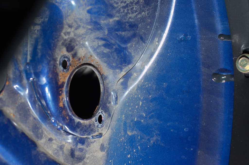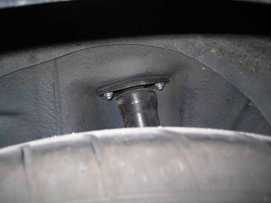 Förstärkningsplattan med skruvar monteras nu från kupén, tryck dit lite sättlim (bild 3, före rengöring och montage av platta), eller annat lämpligt lim som finns liggande. Detta så plattan med skruvar inte skall trilla in i kupén nästa gång man byter bussning. Montera tillbaka stötdämparpaketet med ny bussning och packning samt dom nya självlåsande muttrarna. Vinterkör du din Z3 kan det vara bra att rostskydda skruv och mutter i hjulhuset så dom inte sätter sig som berget tills nästa byte (bild 4).