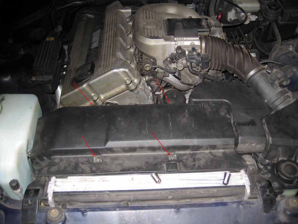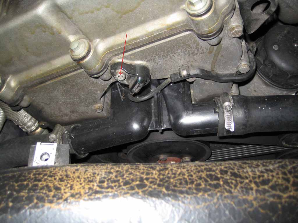 Lossa plastkåpan framför motorn (bild 1) som sitter med fyra skruvar. Skruva loss vinkelgivaren (tror jag det är, bild 2) till kamaxeln. Lossa kylvattenslangarna till termostaten och var beredd med plastskålarna.