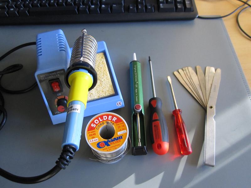 För den som har tålamod att pula med små saker och kan löda är det enkelt att byta glödlampor i klimatpanelen. Kan man inte löda så kan man träna på elektronik-skrot först, eller be en kompis om hjälp med själva lödandet. Glödlamporna, två vita och en röd, kostar 40 kr/st på BMW. Bild 1 visar de verktyg jag använde.