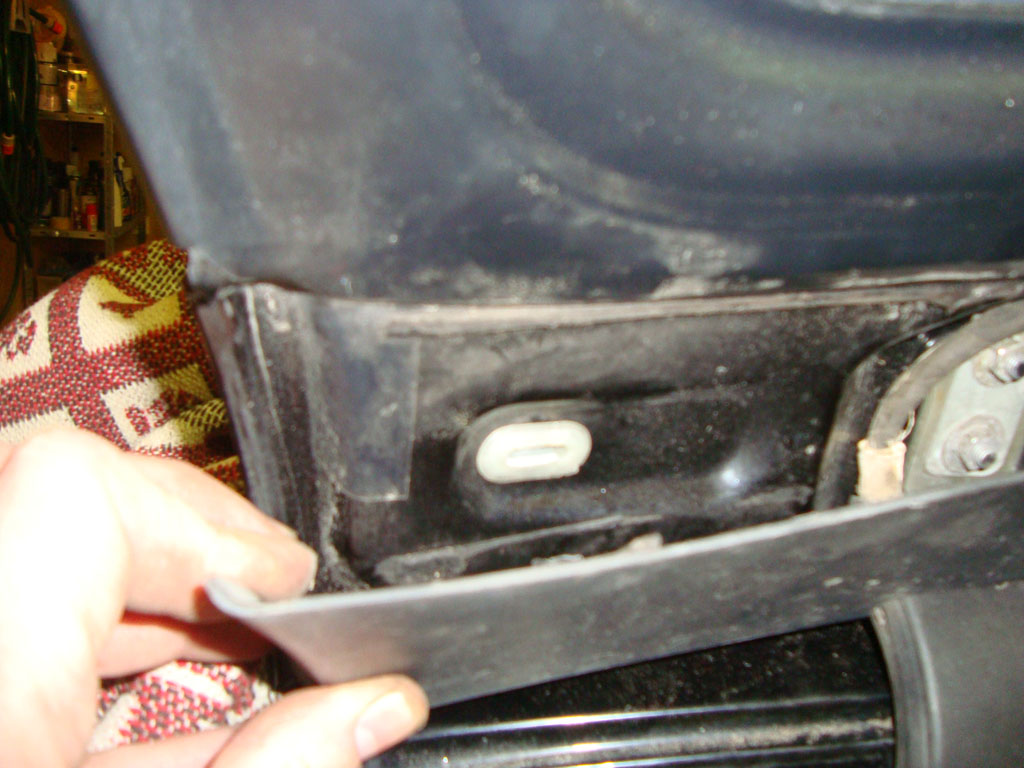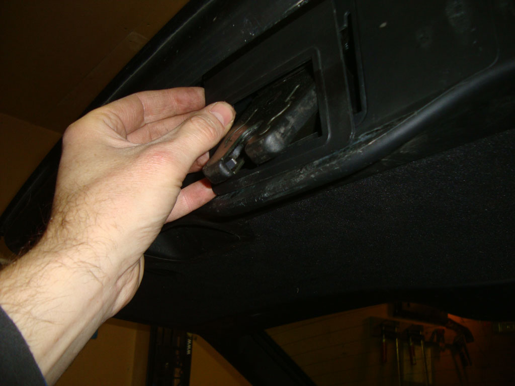 Öppna luckan och ta bort låsningen för gasfjädrarna. Peta bort gasfjädrarna, luckan måste hållas uppe med handkraft nu.