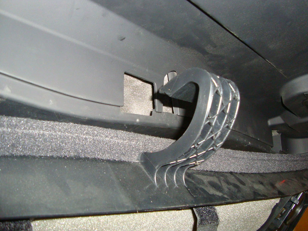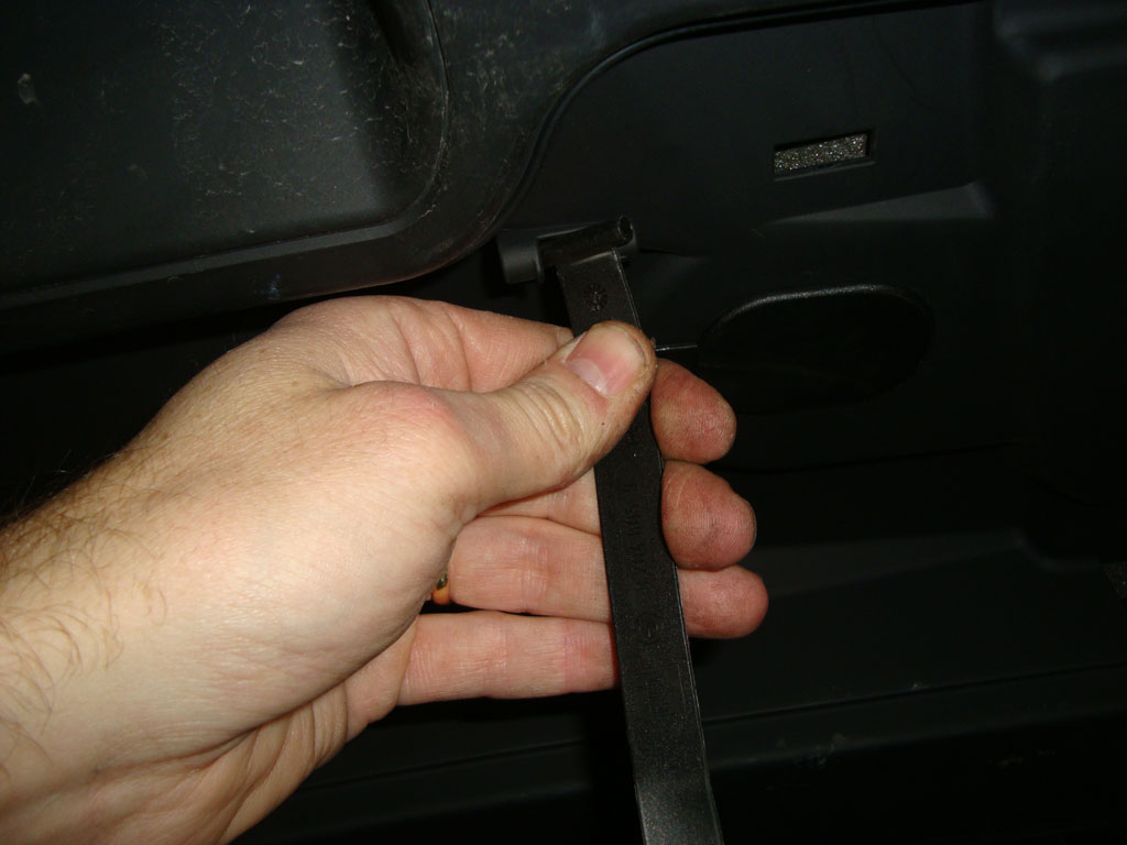 Ta bort verktygsfacket. Tre av skruvarna som håller panelen sitter innanför gångjärnen och det är svårt att komma åt dom med verktygsfacket på plats. Börja med att lossa stoppstropparna genom att trycka dom uppåt/inåt.