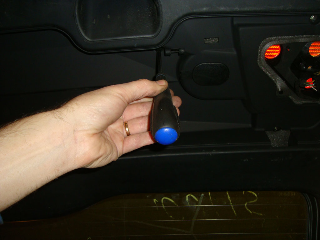 Lossa kåpan över låskistan till bakrutan och torkarmotorn. Den sitter med clips och lossas uppåt. Därunder sitter två av de elva skruvarna som håller panelen.
