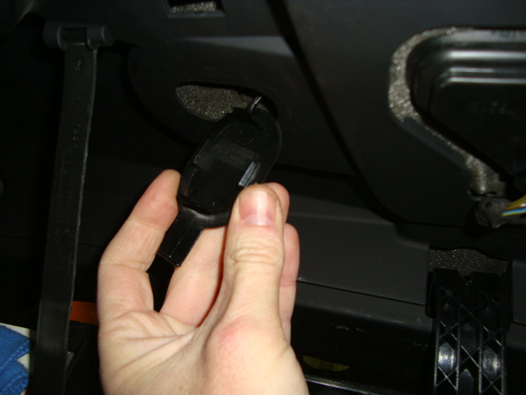 Lossa nödöppningsvajern och peta in fästet i hålet. Nu kan hela panelen enkelt tas bort genom att dra försiktigt så de fyra clipsen lossnar.