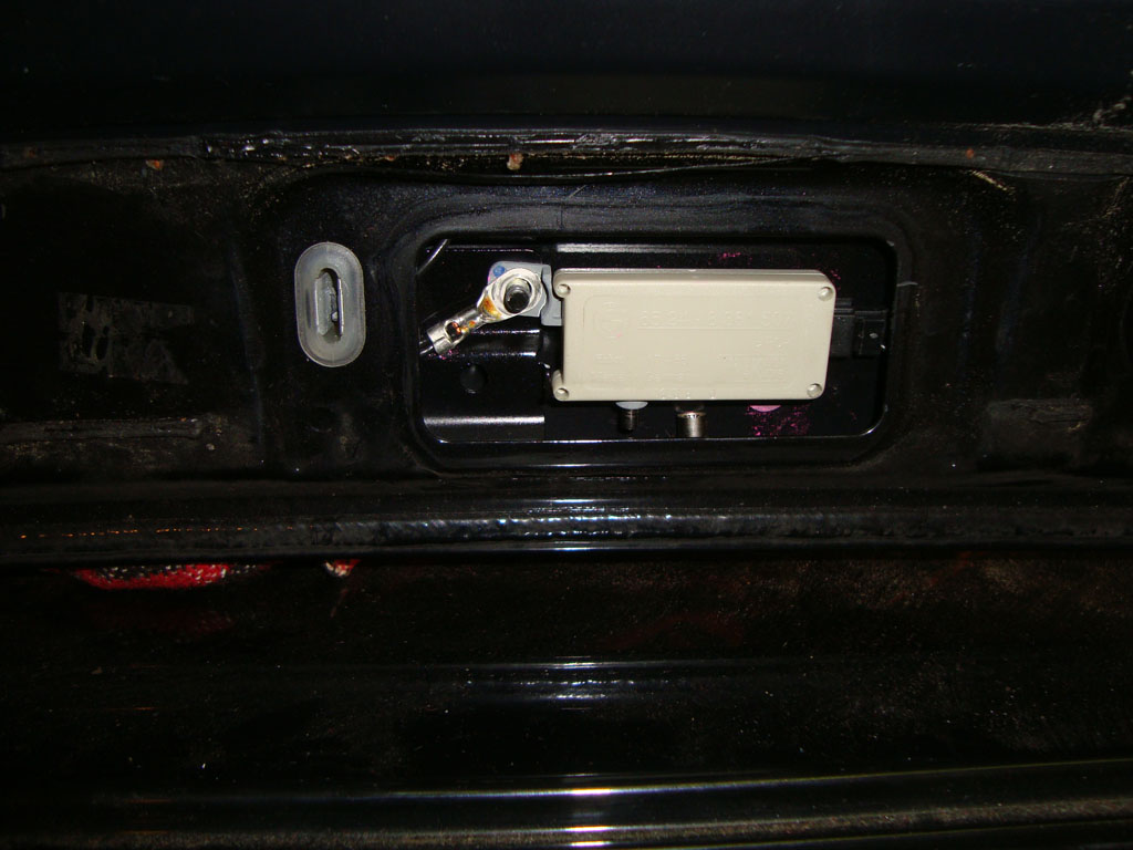 Ta ur kabelstammarna ur rutan och lossa spolarslangen. Bakom täckkåpan sitter antennförstärkaren. Skruva loss bakrutan från gångjärnen. Håll i den så den inte trillar ned när skruvarna är loss, ha gärna en filt eller liknande på taket.