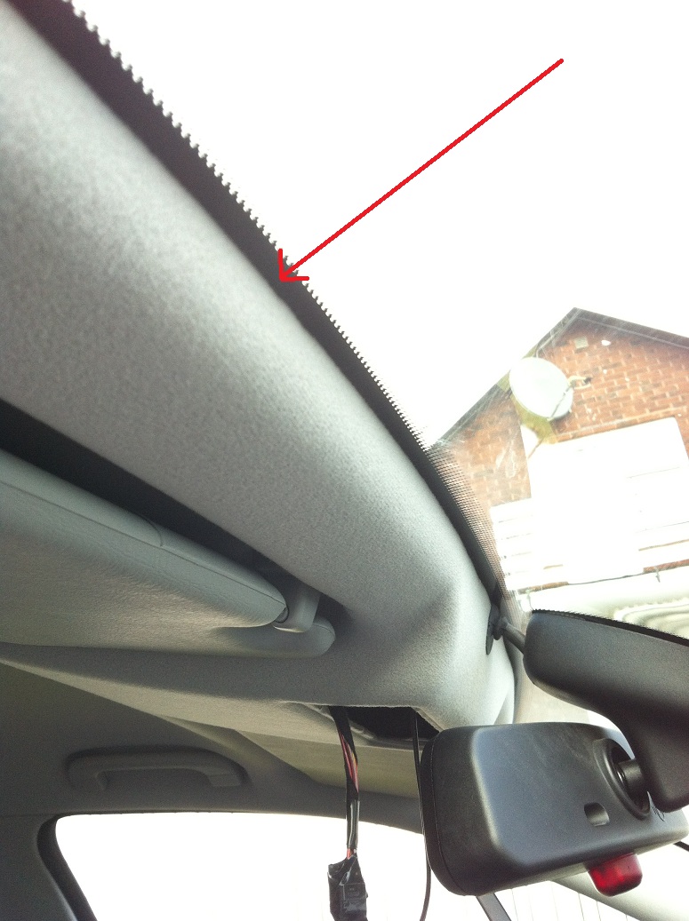 Dra sedan kabeln i taket mot passagerardörren, lättast är att hålla upp kabeln mellan rutan och taket och sedan försiktigt pressa in den emellan innertaket och vindrutan med en skruvmejsel.